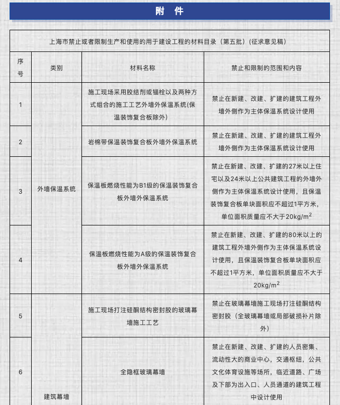 上海市住建委在2020年9月30日發(fā)布了《上海市禁止或者限制生產(chǎn)和使用的用于建設(shè)工程的材料目錄(第五批)征求意見稿》,如今正式文件即將重磅登臺(tái)(后附正式文件原文),其中涉及到外墻外保溫系統(tǒng)的有4條:
